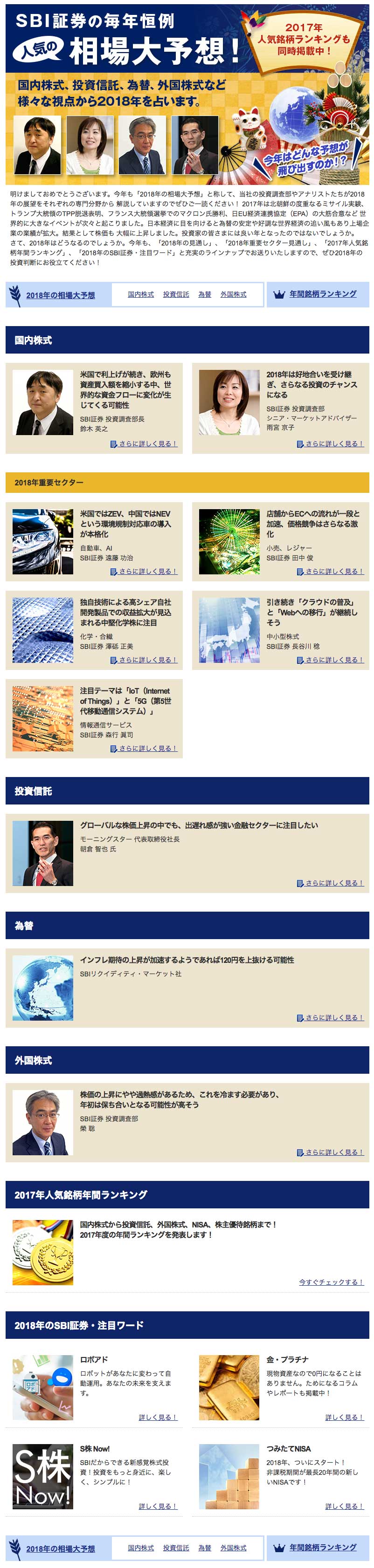 証券会社年始コンテンツのデザイン。原稿と人物写真のみ支給いただき、前年とカラーをガラッと変えたものを提示。 証券会社の通常更新業務の中をぬっての年末作業となった為、短納期でデザインからコーディングまで完了させました。